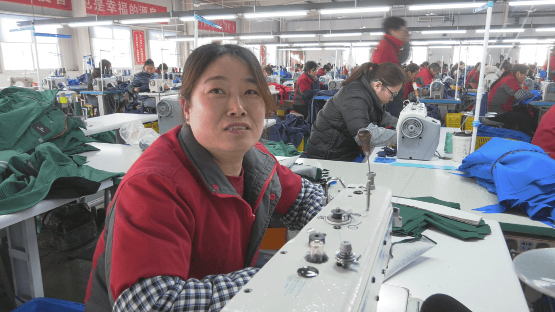 陕西惠泽制衣有限公司中心工厂职工 张宏娟:在这儿反正干得觉着挺稳定的,工资都是按时发,基本上都上四千了。反正管娃弄啥了,觉着也方便,离家也近得很。年底有米、油啥的(福利),平时三八(妇女节),也都给发东西。