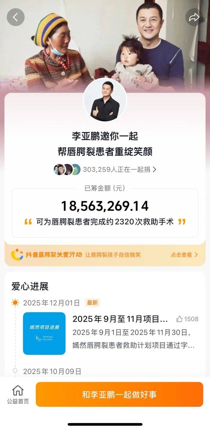 1月16日,“给李亚鹏捐款”成为网络热点,网友涌入李亚鹏抖音平台2025年发布的消息下,寻找“嫣然唇腭裂患者救助计划”捐款入口。截至发稿,捐款页面显示,该项目已获得超30万人捐赠的1800余万元善款。