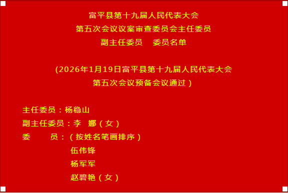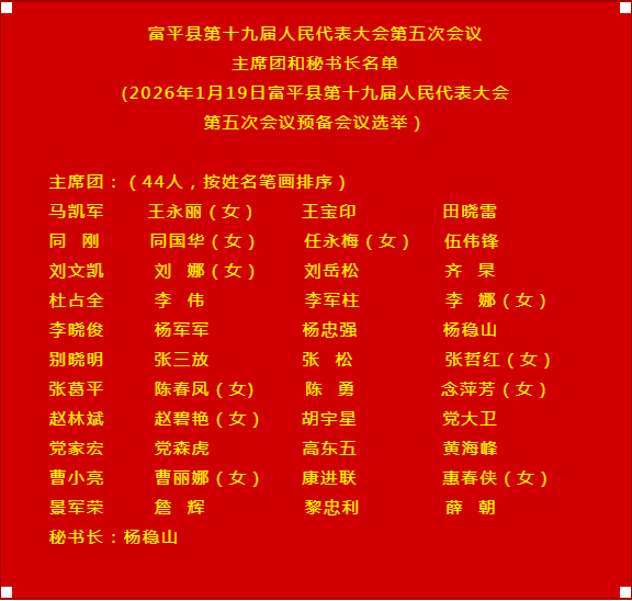 1月19日,富平县第十九届人民代表大会第五次会议预备会议召开。县委副书记、县人大常委会主任杜占全主持会议,县人大常委会副主任杨稳山、张三放、康进联、刘娜在主席台就座。