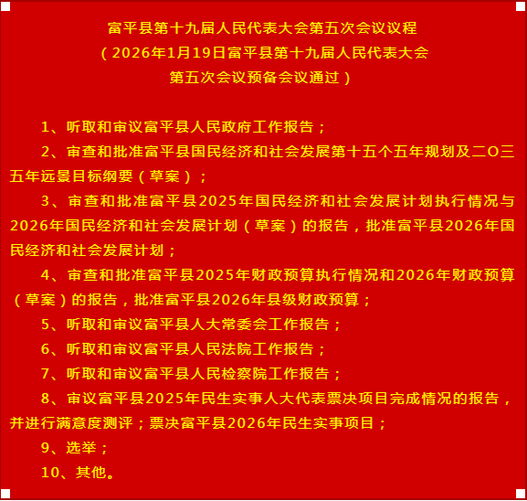 杜占全指出,县十九届人大五次会议,是在“十五五”开局之年召开的一次十分重要的会议,是全县人民政治生活中的一件大事、喜事。开好这次大会,对于贯彻落实县委十九届十一次全会部署要求,动员和团结全县广大干部群众坚定信心、凝聚力量,奋力谱写中国式现代化建设的富平新篇章,具有十分重要的意义。各位代表要切实增强履职责任感和使命感,正确行使民主权力,确保选举任务顺利完成,确保票决项目符合民意、贴近民生;要立足发展所需、群众所盼,认真讨论审议各项报告,努力提出高质量的议案和建议,表达人民诉求,反映社情民意,齐心协力把这次大会开成一个凝心聚力、团结奋进的盛会;全体代表要牢固树立纪律和规矩意识,严格遵守会议各项规定,自觉维护和树立人大代表的良好形象,确保大会风清气正、务实高效。各代表团要加强领导、精心组织、严格要求,保证全体代表按时出席会议、参加分组讨论,确保顺利完成大会各项议程。
