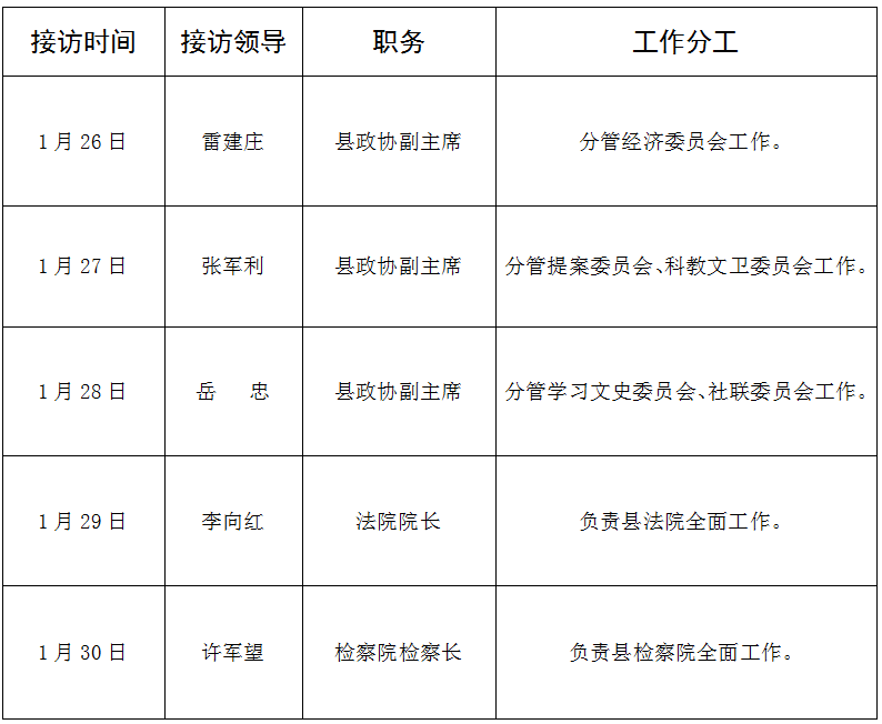 为进一步畅通信访渠道,方便人民群众及时就地反映诉求、解决问题,现将1月26日—1月30日富平县县级领导公开接访安排公布如下: