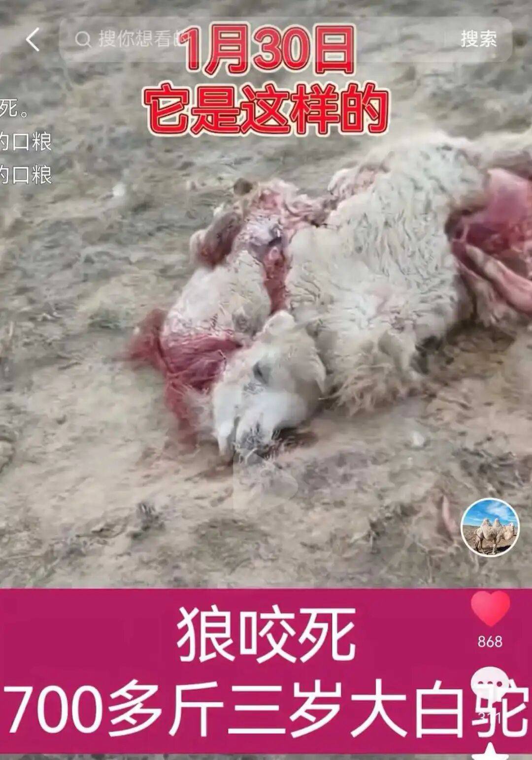 有内蒙古包头的牧民日前发视频反映,自家最近又有一只700多斤的3岁大白驼被狼咬死了,最近三年来已有21头骆驼被狼咬死,总损失约15万元,多次向相关部门反映,未得到解决。