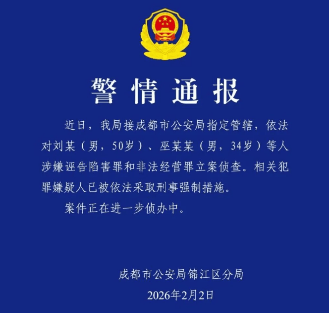 近日,我局接成都市公安局指定管辖,依法对刘某(男,50岁)、巫某某(男,34岁)等人涉嫌诬告陷害罪和非法经营罪立案侦查。相关犯罪嫌疑人已被依法采取刑事强制措施。