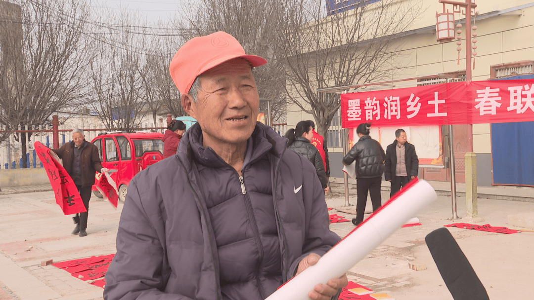 淡村镇亭子村村民 胡根民:今天村上在这儿写春联,我也过来领了一幅,年味儿越来越浓了,新的一年祝大家都顺顺利利。