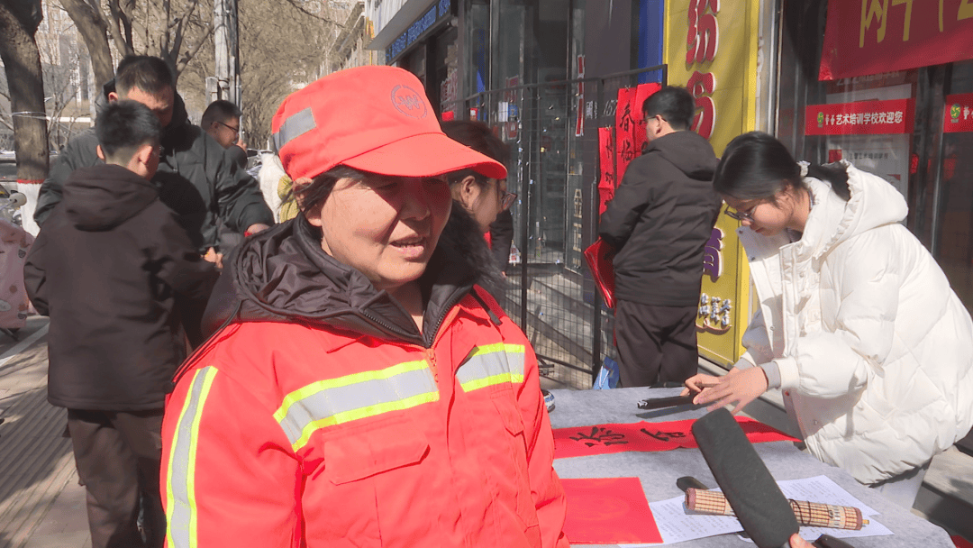 环卫工 张淑娟:今天我们环卫工人在这儿领到新的对联,很高兴,因为都是按照自己选的,老师给自己写的,红红火火过新年。