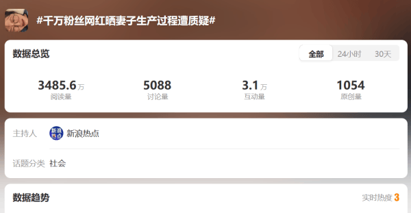 据报道,千万粉丝网红“保罗在美国”发布妻子生产全过程,称产程长达23小时,妻子三级撕裂、产后大出血。
