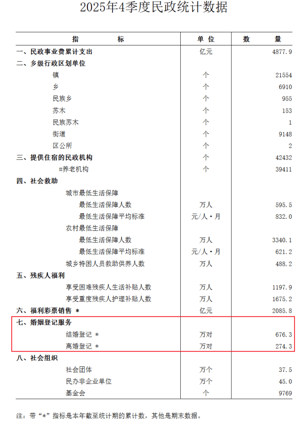 民政部2月11日公布2025年婚姻登记数据,结婚登记676.3万对,离婚登记274.3万对。其中,与2024年相比,结婚登记增加了65.7万对,离婚登记减少77万对。