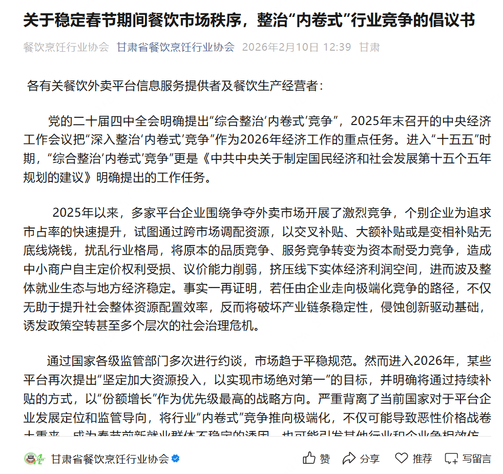 澎湃新闻注意到,部分区域餐饮行业协会也在春节前发文,呼吁强化行业自律,停止低质低价“内卷式”竞争。2月10日,甘肃餐饮烹饪行业协会在一份倡议书中提到,2025年外卖市场的补贴大战,将原本的品质竞争、服务竞争转变为资本耐受力竞争,造成中小商户自主定价权利受损、议价能力削弱,挤压线下实体经济利润空间。协会呼吁整治“内卷式”行业竞争,稳定餐饮市场秩序。