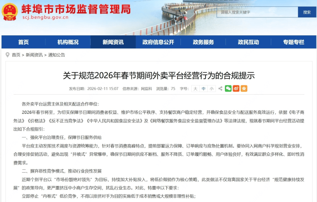 蚌埠市场监管局发布春节外卖合规指引。