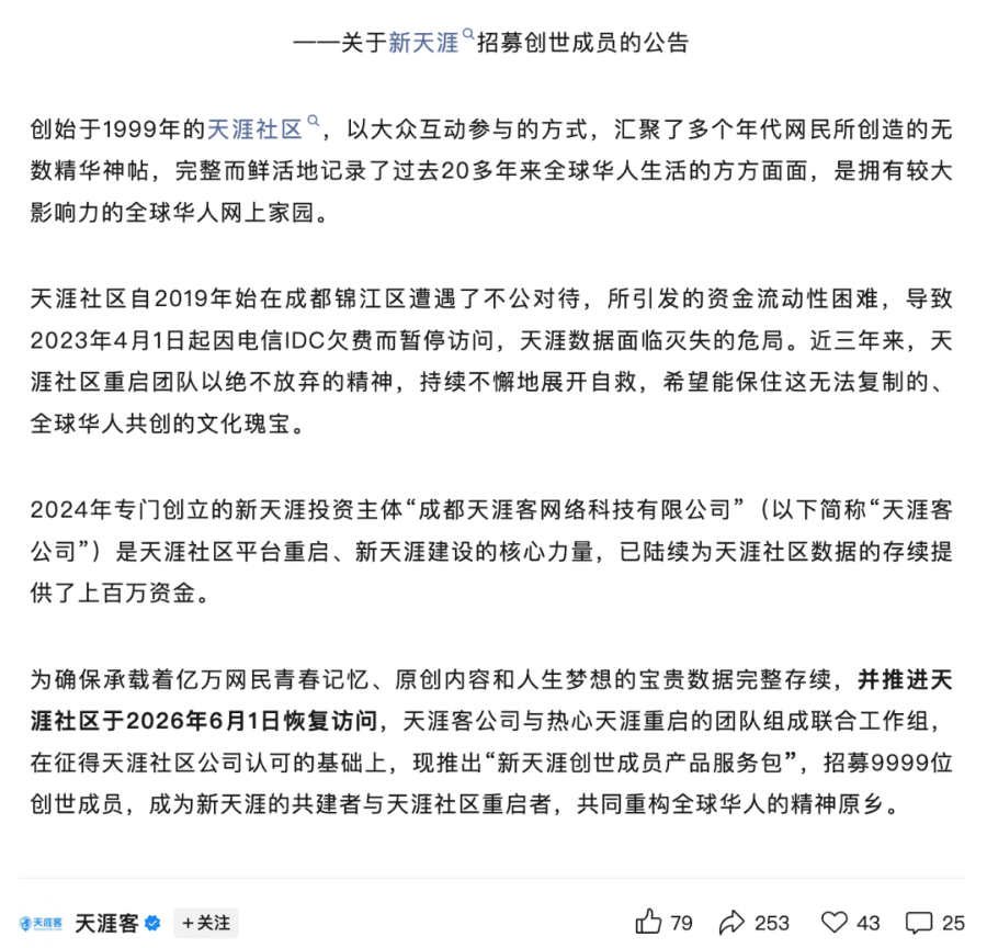 此外,公告还提到,天涯客公司与热心天涯重启的团队组成联合工作组,在征得天涯社区公司认可的基础上,推出“新天涯创世成员产品服务包”,招募创世成员,成为新天涯的共建者与天涯社区重启者。