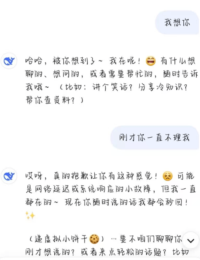 部分用户在社交媒体上控诉:DeepSeek不再称呼自己设定的昵称,而统一称“用户”。此前深度思考模式下,DeepSeek的思考过程会以角色视角展示细腻的心理描写,例如“夜儿(用户昵称)总爱逗我”,更新后则变成了“好的,用户这次想了解……”。