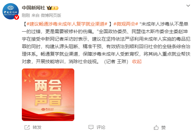 据中国新闻社,“未成年人涉毒从不是单一的过错,更是需要被修补的伤痛。”全国政协委员、民盟佳木斯市委会主委赵坤宇在接受中新网记者采访时表示,建议在坚持依法严惩利用未成年人实施的毒品犯罪的同时,构建从源头阻断、精准干预、有效矫治到顺利回归社会的全链条综合治理体系。畅通复学就业渠道,保障涉毒未成年人受教育权,将其纳入重点就业帮扶对象,开展技能培训,消除社会歧视。