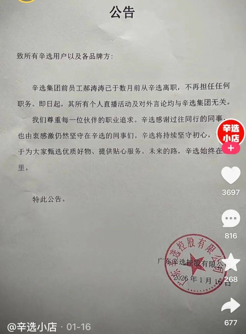 今年1月,辛选曾对外宣布郝涛涛离职。当时辛巴的态度相对克制,仅表示人员流动“谁在与不在都是正常的事”。1月16日,一份加盖广东辛选控股有限公司公章的官方公告,记录下了双方当时相对平静的切割方式。公告称,郝涛涛已于数月前从辛选离职,此后其个人直播及对外言论均与辛选集团无关。整份声明措辞相当克制,不仅写明“尊重每一位伙伴的职业追求”,还专门提到“感谢过往同行的同事”。彼时看上去,这更像一次体面的“和平分手”。但仅过了三个月,辛巴就在直播间里公开放话“全面开战”,甚至抛出“悬赏加刑”的激烈表态,前后态度反差明显。