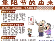 重阳节,农历九月初九,二九相重,称为“重九”,民间在该日有登高的风俗,所以重阳节又称“登高节”。还有重九节、茱萸、菊花节等说法。由于九月初九“九九”谐音是“久久”,有长久之意,所以常在此日祭祖与推行敬老活动。